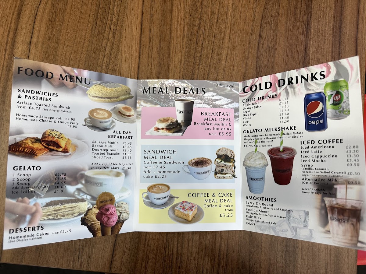 The menu at Espositos Court Hey Park offers a variety of options suited for breakfast, coffee breaks, and light meals. Visitors can choose from a range of hot and iced coffee beverages, including Iced Americano, Iced Latte, Iced Cappuccino, and Iced Mocha, with options for syrup and alternative milk to customize drinks.